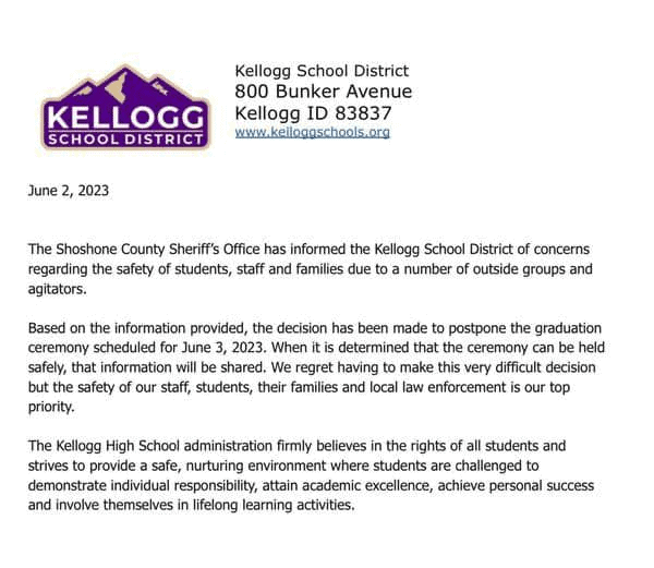 Kellogg High School decided to cancel classes for the afternoon, releasing students at 10:45am rather than face continued disruption. Shortly thereafter, they released a statement postponing their graduation ceremony as well. In the statement, they blamed “outside groups and agitators” for threatening the safety of students, staff, and families.