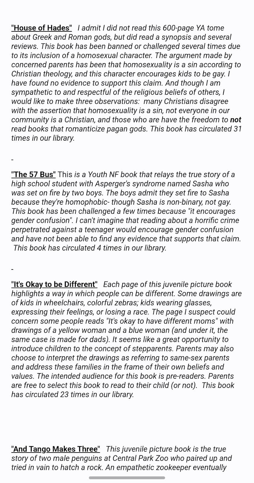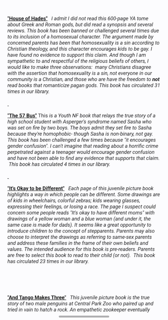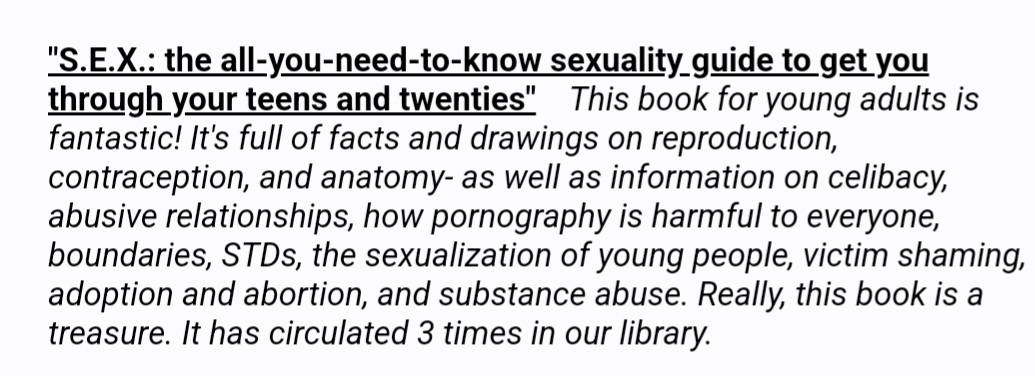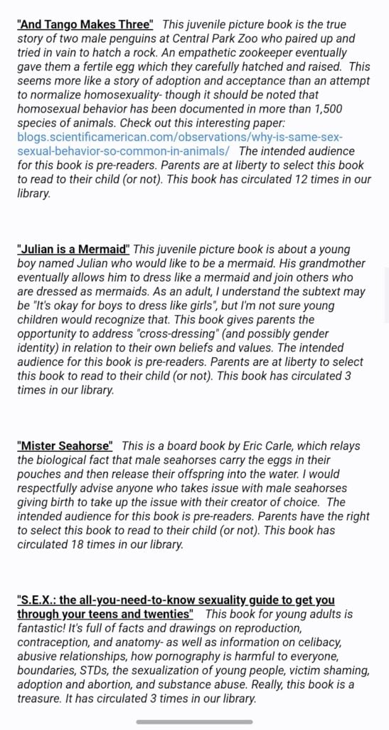 It's unclear why any public official would think it’s appropriate to teach kids about BDSM or how to masturbate or normalize transgenderism. Most taxpayers would be appalled to find out that a library district is so willing to distribute material harmful to kids. Yet public employees continue to defend the provision of obscene materials to minors instead of upholding their moral and legal obligation to protect children.