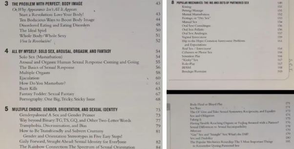 Written by Heather Corinna, “S.E.X.” contains claims like “masturbation is the bomb” and sections like “How do you masturbate?” It has sections on sexual fantasies or how to stimulate multiple orgasms.