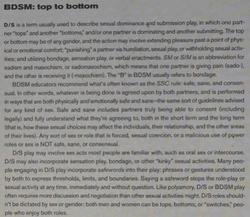 “S.E.X.” encourages “kink” and has detailed instructions for how to stimulate sexual pleasure. For example, the book features tips on practices like BDSM (“some people self-restrain during masturbation. Others use rope or cord[...]”), how to “talk dirty” for cybersex, analingus, and blood or body fluid play.