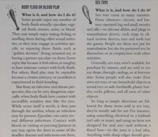 One portion describes how “some people enjoy any number of body fluids sexually: ejaculate, vaginal fluids, menses, urine or blood.” It goes on to describe “golden showers” and notes that “fluid play may be enjoyable because a certain intimacy or sacredness is experienced in ‘fluid-bonding.’”