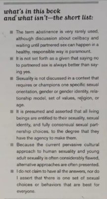 The book promotes the concept of friends with benefits and goes so far as suggesting that “what it means to be a virgin really can only be defined by you.” It also suggests readers “might give some thought to abandoning the concept of virginity altogether.” The book adds: “However nicely, or in different contexts, it is presented by some now, it is an idea that, throughout history, has been sexist, heterosexist, classist, and oppressive, and virginity as an ideal has actually done the opposite of what many would aspire to do: it has devalued sexuality and intimacy–and women–rather than making them more valuable.”