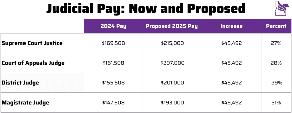 Well, we called it. In the past few weeks, key members of the Idaho judiciary wrote a letter, and Idaho Supreme Court Chief Justice Richard Bevan spoke to the Legislature about the “need” for dramatic increases of 27% to 31% in judicial salaries. Here is what their proposed increases look like: