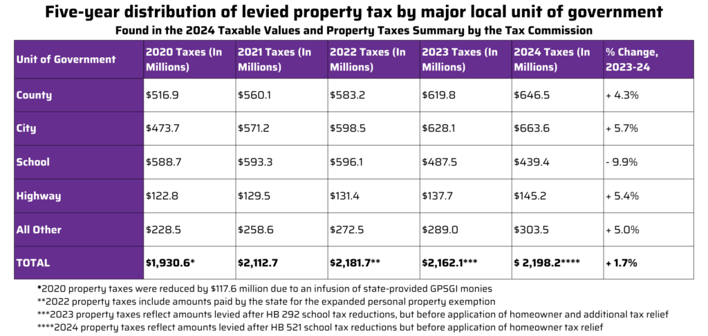 There is probably some confusion among the public concerning how much relief has been achieved. After reviewing the data for the last four years, from 2020 to 2024, the property tax relief has kept overall property taxes flat after accounting for the tax relief applied to schools and directly to homeowners. But, to be clear, budgets are not decreasing; sales taxes are just being shifted to cover property tax budgets. We see this in the chart below, where schools require less property taxes because they are getting more from the state. In four years, the counties have increased their property tax take by 25%, and the cities have increased theirs by a whopping 40%.