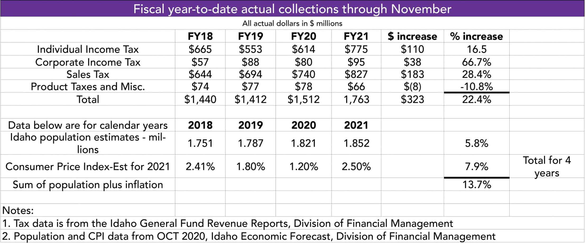 See the chart below for what has transpired from Fiscal Year 2018 (FY18) to FY21. The revenue numbers below are year-to-date, meaning they compare the same time period in each fiscal year, in this case July through November, in order to compare apples to apples.[efn_note] Idaho General Fund Revenue Report, Division of Financial Management. Prepared by Derek Santos and Greg Piepmeyer. December 2020 and December 2019.[/efn_note]