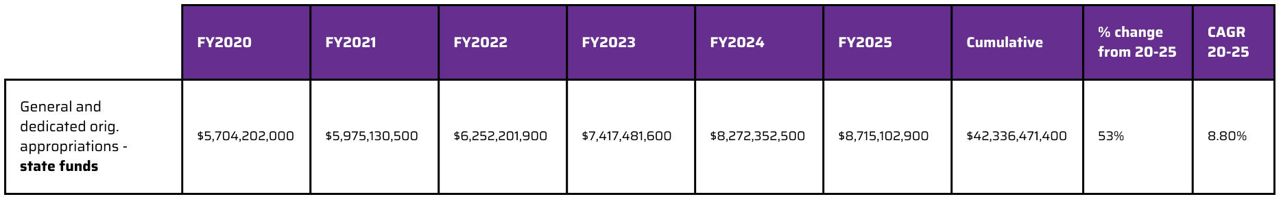 What we see is that state spending, excluding federal dollars, has increased 53% over five years at a compound annual growth rate (CAGR) of 8.8%.